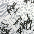 白地ベースに、グレイ~黒の英字とアニマル調モチーフを重ねた柄は、