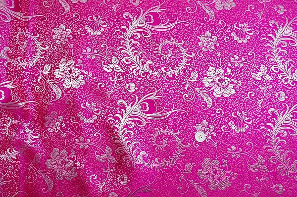 よさこいなど衣装などに最適な チャイナドレス生地・チャイナ生地 羽根と牡丹・ショッキングピンク地×銀 【50cm単位】 (0635-88)